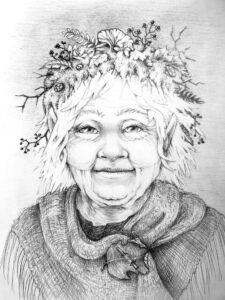 I was in my mid-fifties, when one night I dreamed I was a Fairy Woman named Granny Root. In my dream, I arose from my bed of moss and walked from the woods into the city. I had a magic walking stick. My clothes were made of scraps of fabric and leaves woven together with spider webs. I traveled here and there, helping people see the wondrous magic of the world.